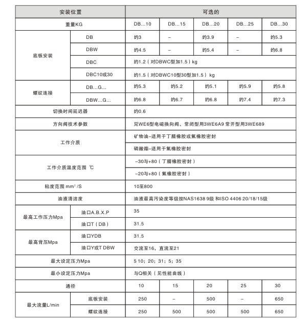 用于底板安裝,安裝面按DIN24340 E型,ISO 6264和CETOP-RP 121 H,用于螺紋連接,用于油路塊安裝。4種調(diào)整元件:①旋鈕②帶護罩的調(diào)節(jié)螺栓③帶刻度的有鎖旋鈕④帶刻度旋鈕。5種設(shè)定壓力,借助于安裝在其上的電磁方向閥操作卸荷??蛇x的切換時間延遲(僅DBW型)。